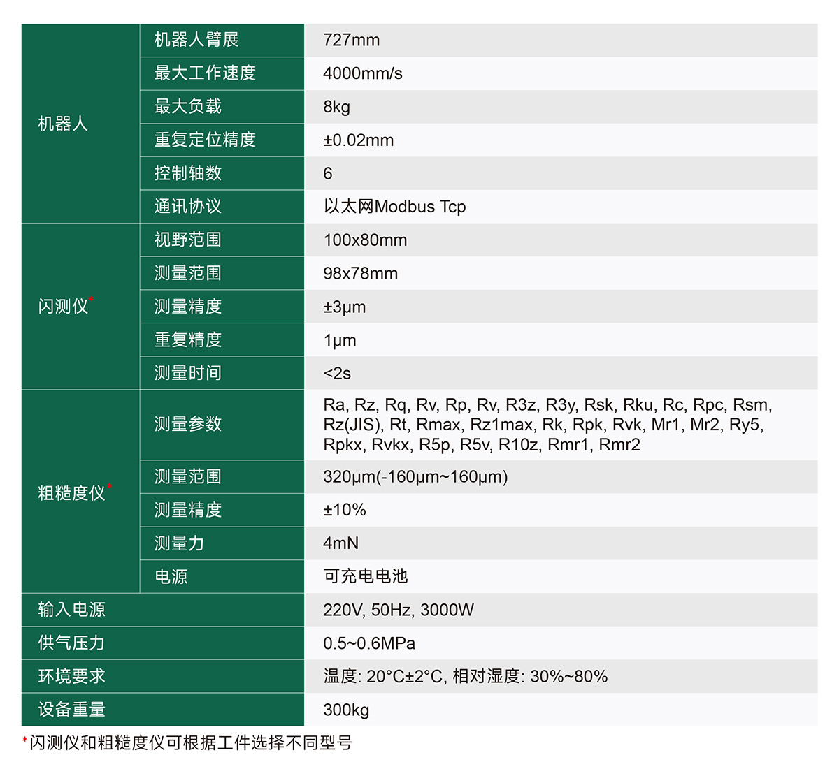 六轴机器人臂展达727毫米,重复定位精度高达±0.02毫米,8公斤最大负载确保各类工件稳定抓取。闪测仪支持定制,测量精度±3微米、重复精度1微米,搭配自动测量算子,可同时完成宽度、孔环、夹角等多元素检测;粗糙度仪同样支持定制,满足不同工件检测需求。
